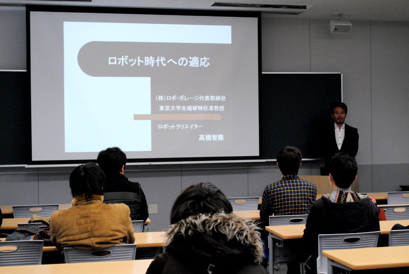 先の2月11日にロボットクリエイターの高橋智隆氏を講師にお招きし、スマートシステム学科生を対象とした特別講義「ロボット時代への適応」を開催しました。高橋氏は(株)ロボ・ガレージ代表、東京大学先端科学技術研究センター特任准教授、ヒューマンキッズサイエンスロボット教室アドバイザーなど多くの肩書をもっておられますが、2009年4月から2014年3月まで、5年間福山大学の客員教授として学科の講義を担当して下さっていました。高橋氏設計製作のロボット「クロイノ」が福山大学のCMに出ていたのを覚えれおられませんか? 先生のご活躍への注目度はその当時より益々上がり、現在は、様々なロボットプロジェクトに参加され、多忙な日々を送られております。